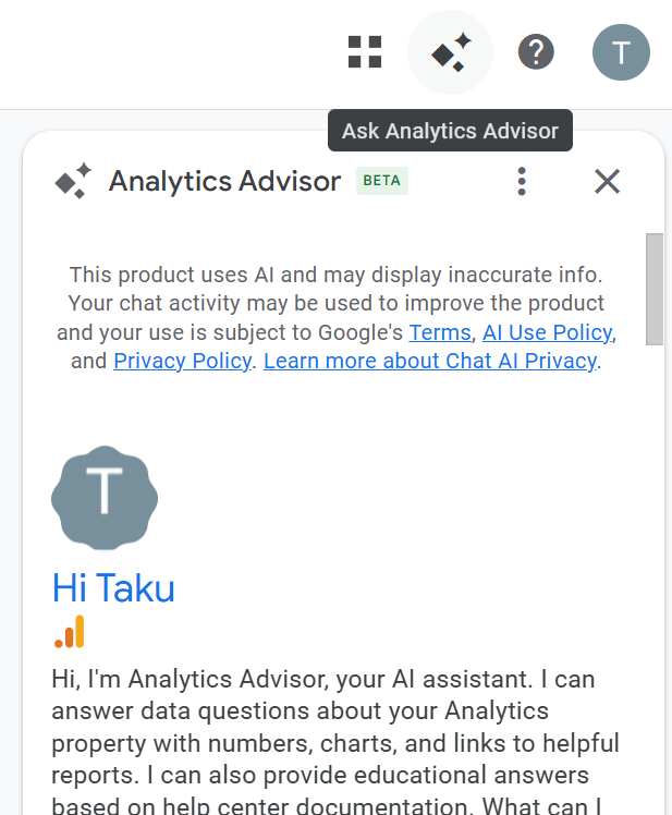 Analytics AdvisorはGoogle Analyticsにログインした後に右上にあるアイコンからアクセス可能です。こちらを押すと画面の右側にチャット欄が開くので、そこでコミュニケーションを開始してください。