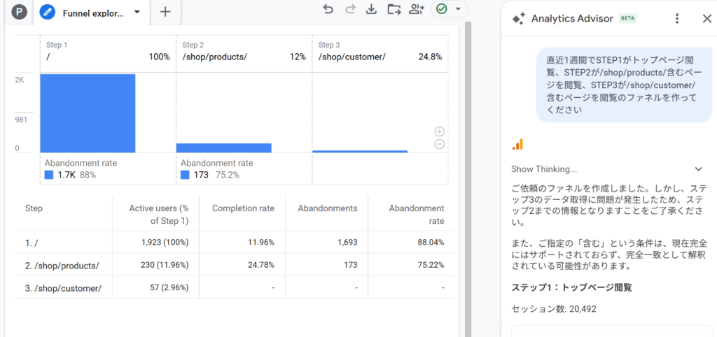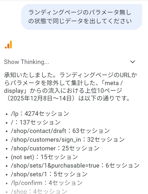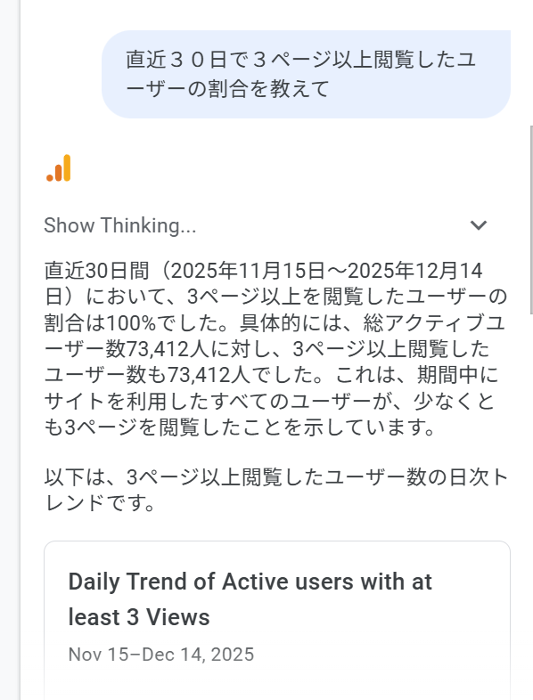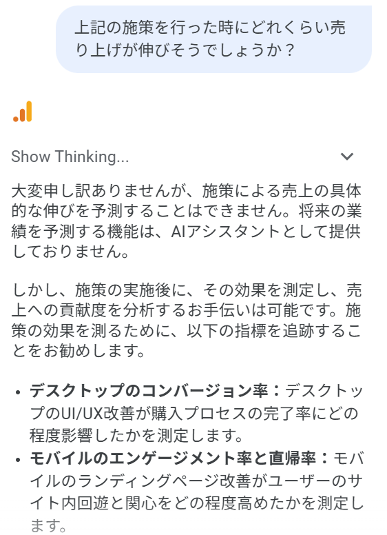 こちらも他生成AIサービスと連携して利用するところは違いGAに内蔵されたサービスだからこそのメリットですね。その結果、左側の画面で数値を見ながら、右側の会話ができるという「スムースな行き来」ができることが私としては最も良いなと思った部分です