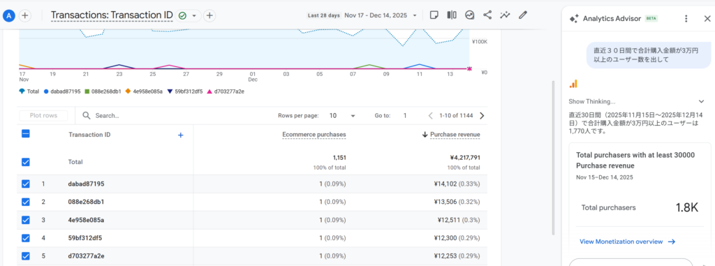 こちらも直近30日で合計金額3万円以上購入したユーザーを聞いているのですが1,770人と出てきます。同期間での購入回数が、画像真ん中にある通り1,151回なのでこの数値もおかしそうです。