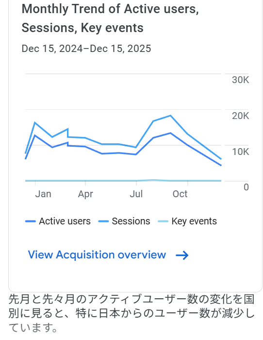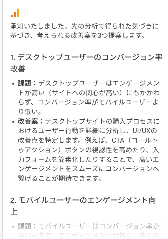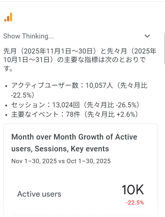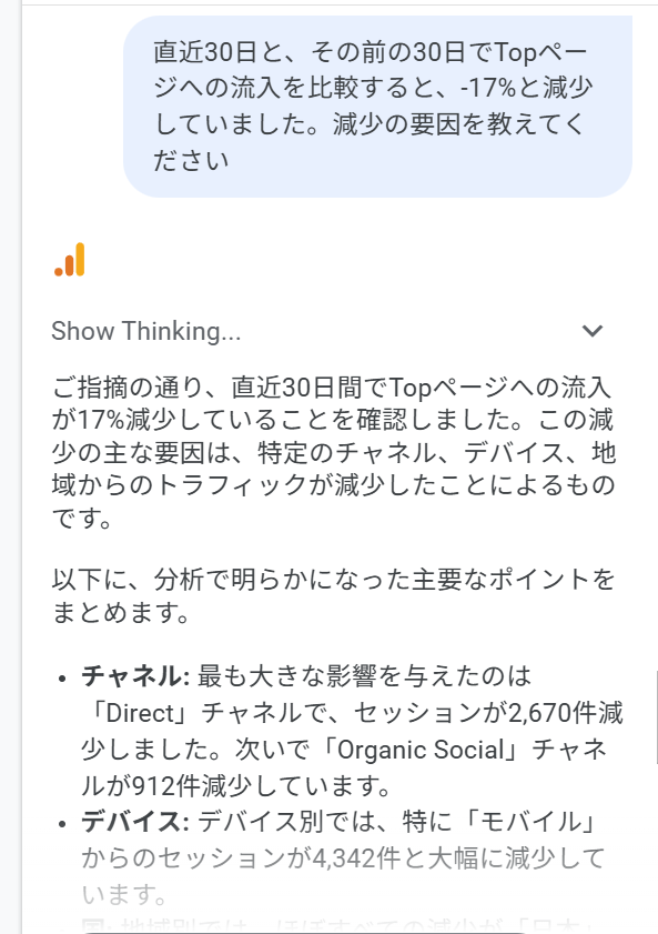 GA4内でAIを利用して、データに関する質問に答えてくれる機能です。簡単な集計や比較はできますが、深い分析までは行えるわけではありません。どこまで「使いやすいか」はそれぞれ判断が変わってくるかと思います。アナリティクスアドバイザーで出来ること、出来ないことをぜひ本ページを読んで理解していただき、どう使うか判断してもらえれば。