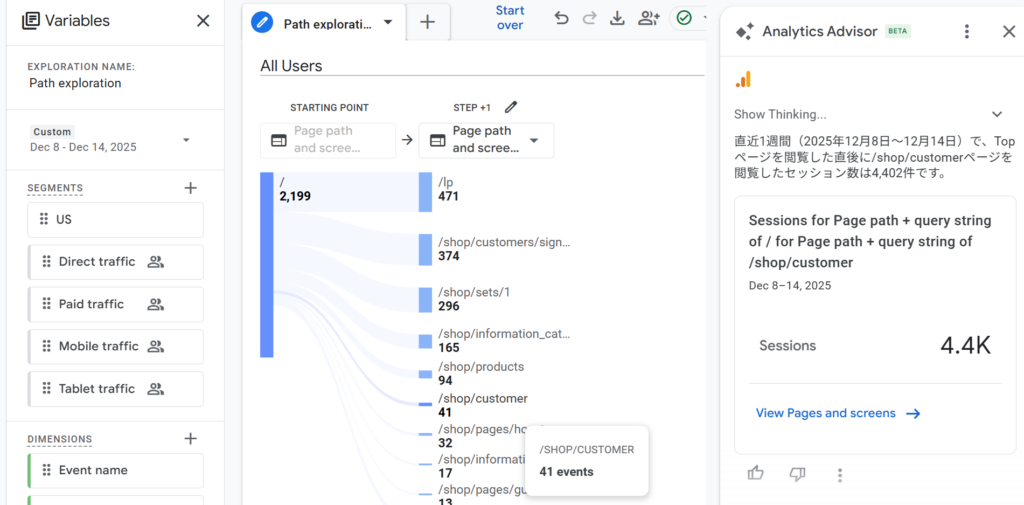 画像を見ての通り、同期間にTopから/shop/customerへの遷移数は41回なのですが、Analytics Advisorでは4,402件と全く違う数値を出してきます。