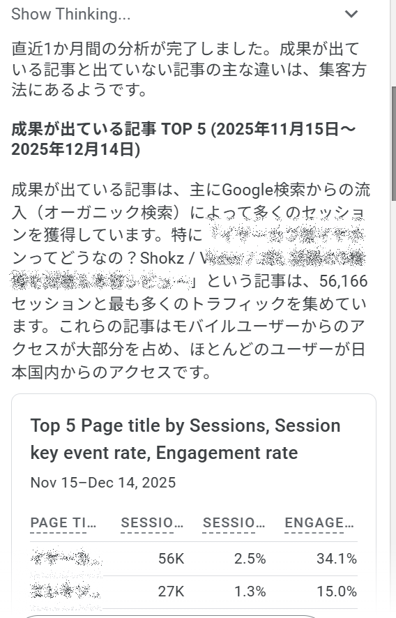 また使う上で現時点(2025年12月)ではセグメント系のデータが不正確です。出来ないと言ってくれることもあるのですが、何7も言わずに不正確な数値を出してきます。少し複雑なリクエストを投げた場合、数値「感」があっているかを確認することを忘れないでください。例えばキーイベント数や売上が同期間のサイト全体より大きい、あるいは極端なエンゲージメント率(100%が大きな流入元で出る)、遷移数や率(遷移先のページビュー数以上に遷移数がある)などが該当します。