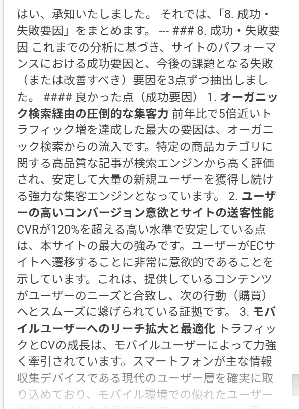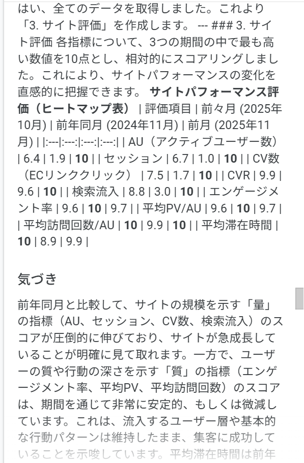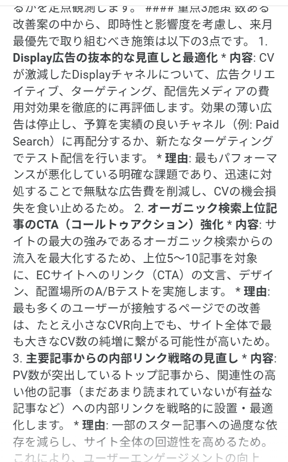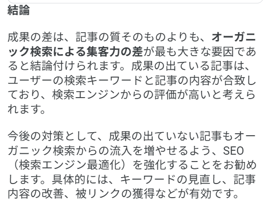 結果としては想像通りのアウトプットですが、ちゃんとこういった分析が文章で出てくるのはありがたいですね。