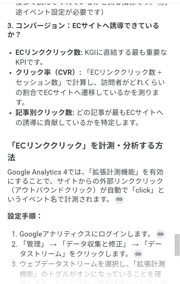 KGIやKPIに関する相談をしたところ、適切な案内をしてくれました。GA4のヘルプ等も参照してくれるので、この辺りの実装や設定周りに関しては信頼できそうです。