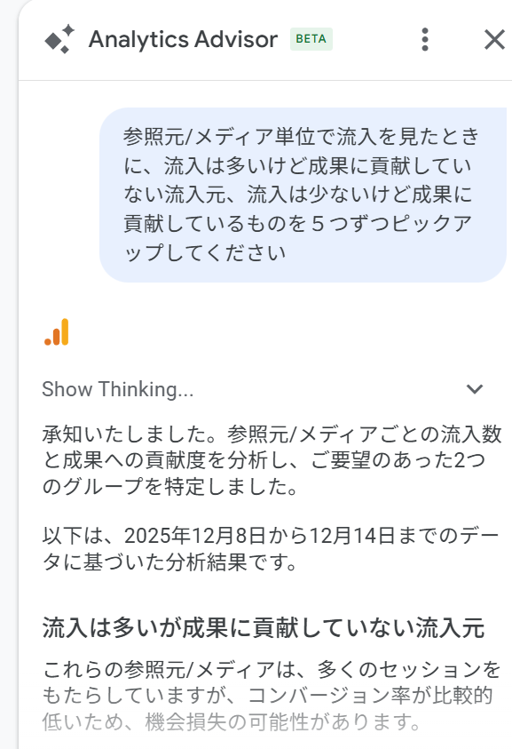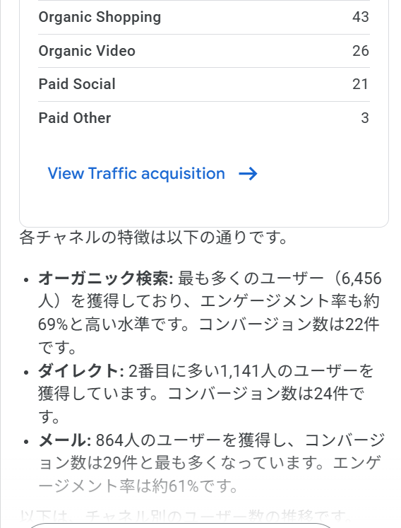 流入元ごとの情報を文章でまとめてくれます。この辺りも問題ありません。
